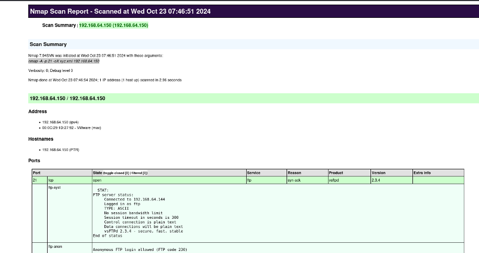$ nmap -A -p 21 192.168.64.150 -oX xyz.xml