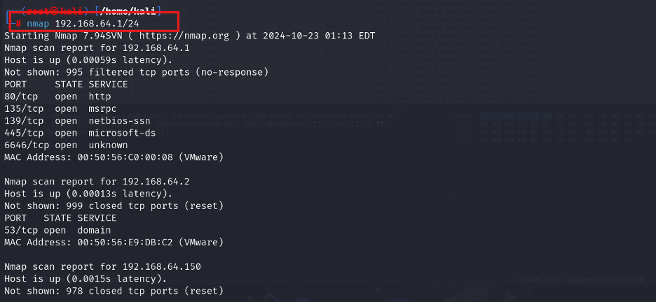 The example we just saw tells Nmap to check out the whole 192.168.40.0 network using CIDR notation. CIDR notation puts together the network address and subnet mask (in binary bits) with a slash between them.